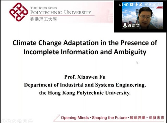 2022年6月23日上午10:30,香港理工大学符啸文教授受邀以线上方式为成人抖音 师生作了一场精彩、生动、有趣的学术报告。他的报告题目为:不完备信息和模糊情形下大气变化的适应(Climate Change Adaptation in the Presence of Incomplete Information and Ambiguity),成人抖音 百余位师生聆听了此次报告。