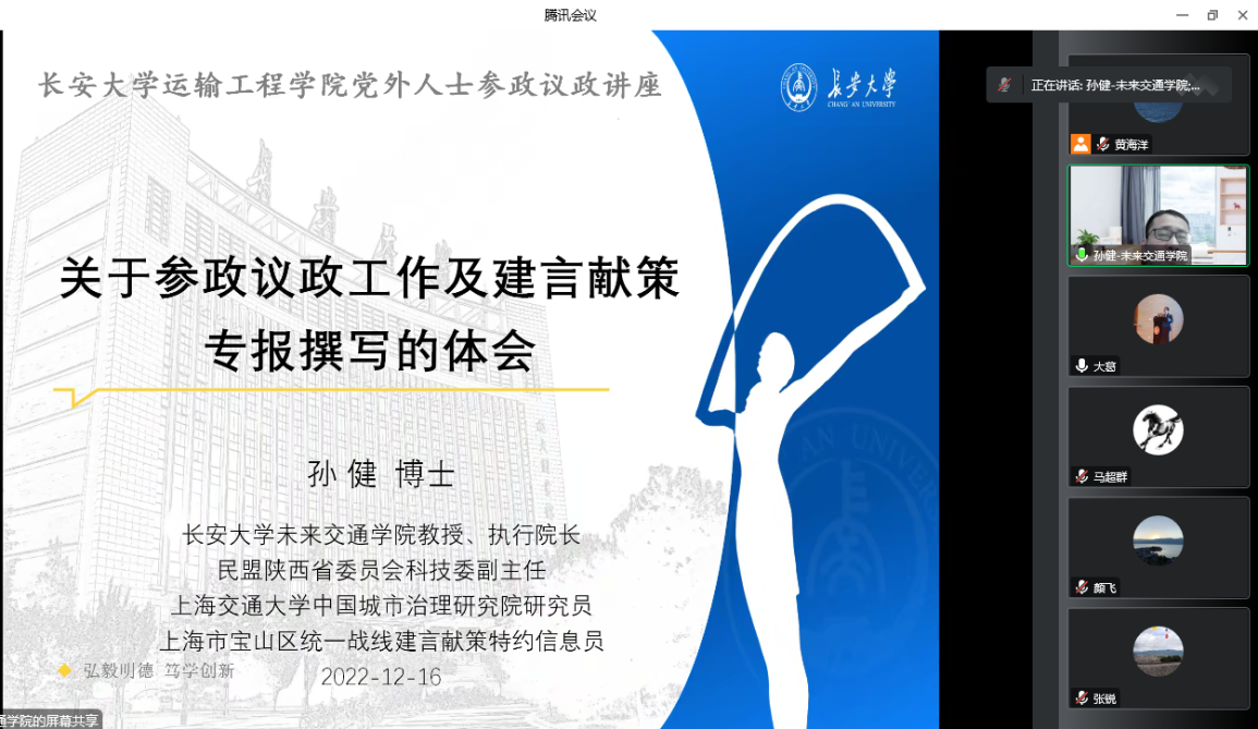 会议邀请到了成人抖音 未来交通学院孙健教授作《关于参政议政工作及建言献策专报撰写的体会》报告。孙健从参政议政概述和定位(以民盟为例),参政议政的主要形式即民主党派参政议政四类渠道,参政议政建言献策文稿撰写,案例简析四个方面,重点介绍了政策建议信、调研报告、参政议政建言献策专报的写作要求,同时围绕个人工作实际和交通运输专业优势,从选题、报送渠道等方面分享了撰写建言献策专报成功的案例和经验。