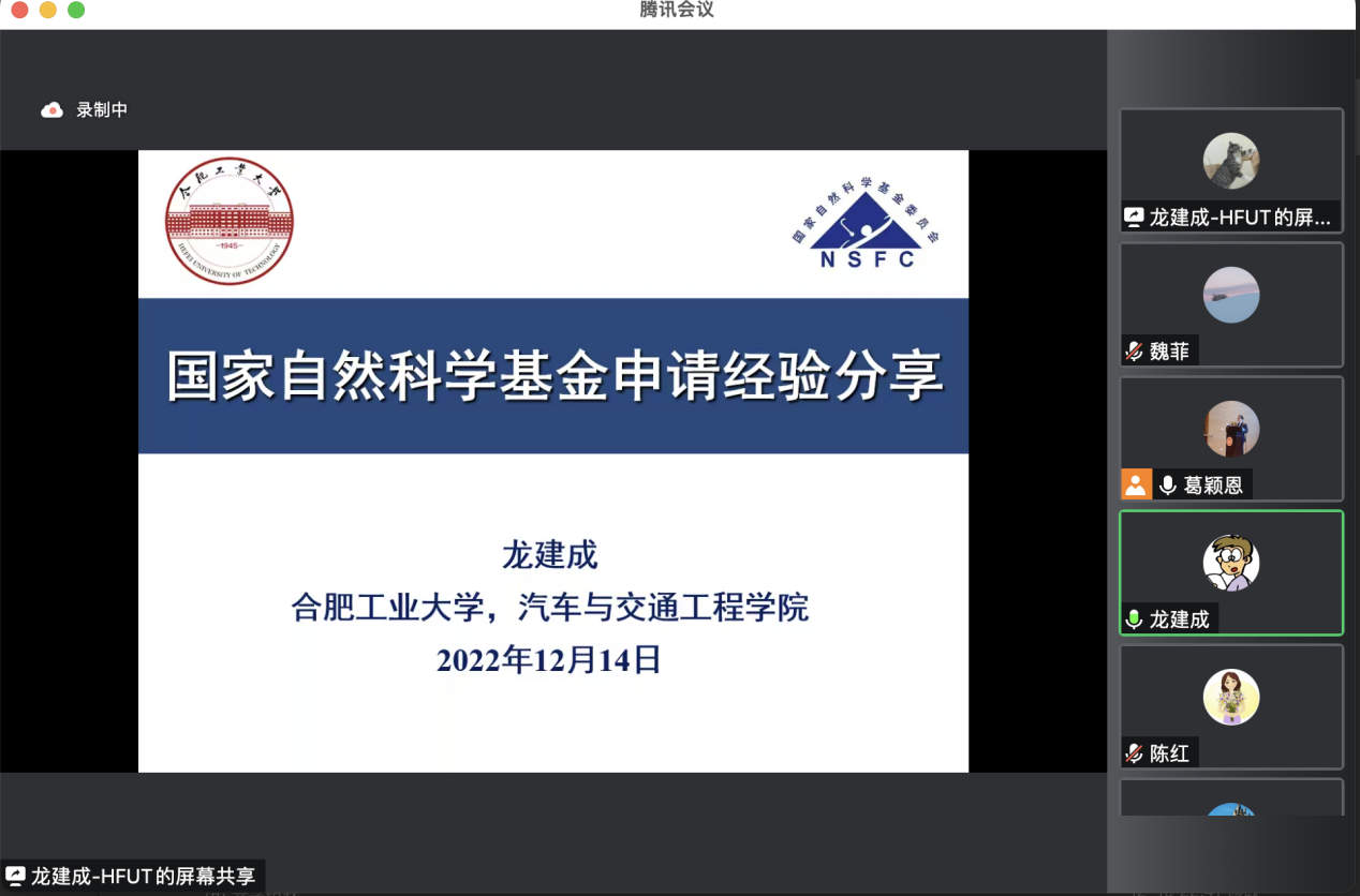 首先,学院邀请合肥工业大学汽车与交通工程学院院长龙建成教授为成人抖音 教师作了国家自然科学基金申请的辅导报告,龙建成教授从国家自然科学基金的战略定位、申报概要、高质量撰写国家基金申请书等方面,深入细致地剖析如何提高申请书撰写的质量等问题。之后结合成人抖音 教师的交流提问及多年申报实际经验,从多个方面深入剖析国家自然科学基金项目申报的策略等内容。