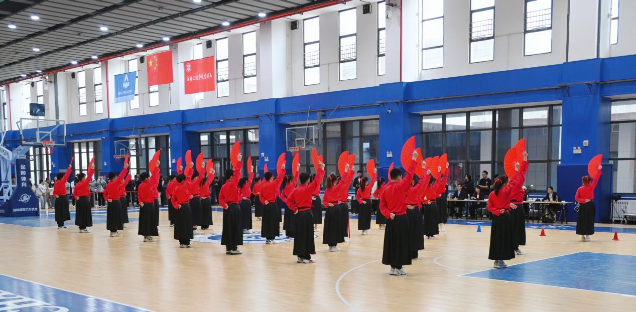 赛场之上,伴随着国风歌曲《骁》的激扬乐声,学院代表队呈现了一场融合技巧、美感和传统文化的绚丽表演。学院代表队动作整齐划一、气势恢宏,舞动之间将柔美与力量完美结合,诠释了扇子舞的刚柔并济。