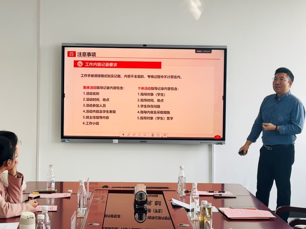 聘任仪式结束后,学生工作办公室主任董彬领学了《成人抖音 本科生班主任选聘管理办法》《成人抖音 本科生班主任选聘管理办法》,重点从班主任的选聘程序、工作职责、管理考核等方面对政策文件进行了详细解读,并结合历年班主任工作开展实际,与本科生班主任进行了工作交流。