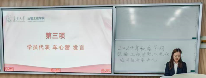 培训班学员代表车心蕾发言,她代表本期所有入党积极分子,表达了端正入党动机、珍惜培训机会、服从组织管理、发挥模范作用的决心。