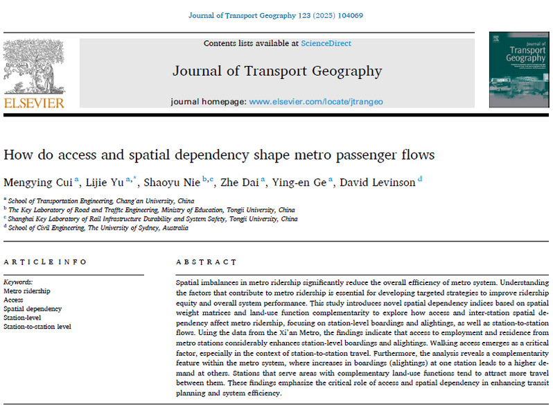 交通运输研究领域国际权威学术期刊《Journal of Transport Geography》近日发表论文:《How do access and spatial dependency shape metro passenger flows》,该论文第一作者为成人抖音 崔梦莹副教授、余丽洁老师为通讯作者。